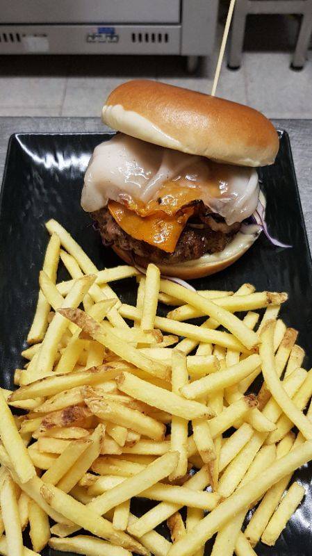 Hamburger dalla struttura grossa e granulosa, senza aromi aggiunti, per conservare inalterato il gusto del manzo, carnoso, appetitoso, sugoso e tenero da addentare. Tipico della cucina americana . Servito con Patate Fritte