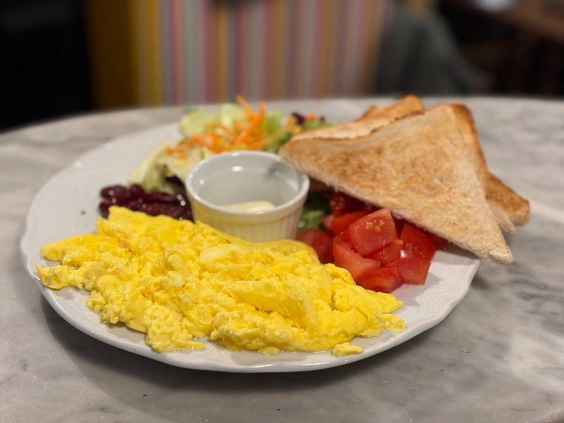 SCRAMBLED EGGS served with with Red Beans, Tomatoes, Salad, Toasted Bread and Butter