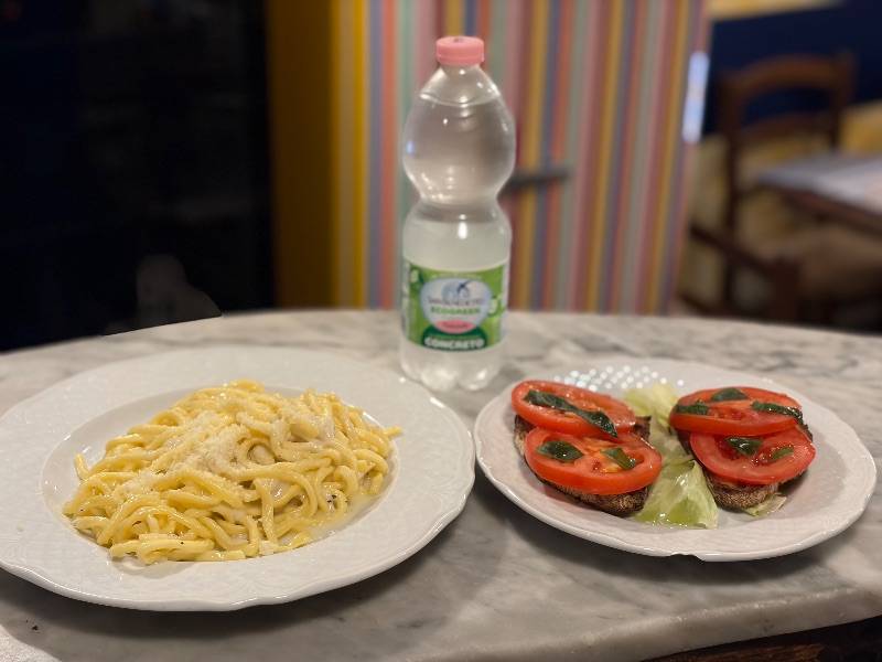 1/2 L Water (Still Or Sparkling) + Tomato Bruschette + Tonnarelli Pasta with Pecorino Cheese and Black Pepper