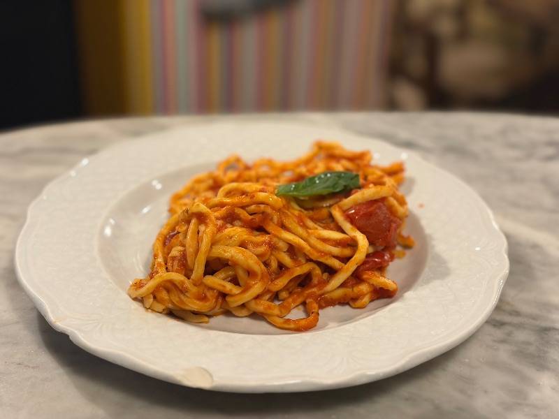 Tonnarelli Pasta with Tomato Sauce, Jowl Bacon and Pecorino Cheese