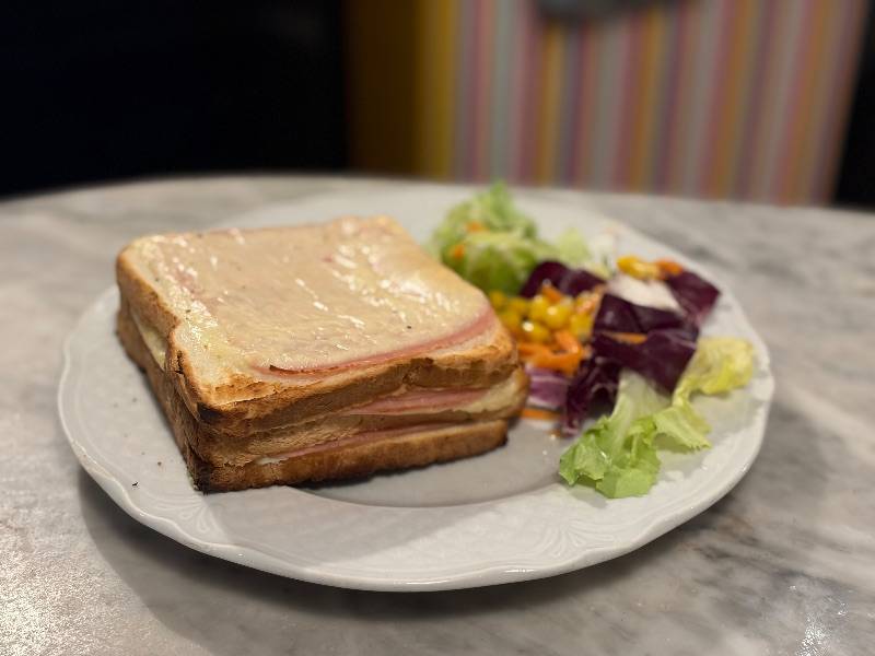 Pan tostado, salsa bechamel, queso emmental, jamón cocido servido con ensalada