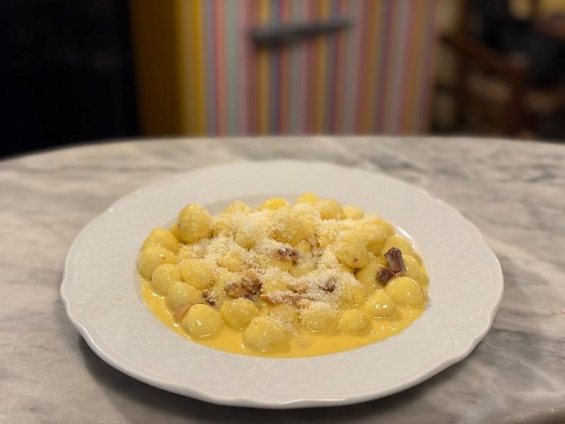 Gnocchi met eieren, varkenswangspek, pecorinokaas en zwarte peper