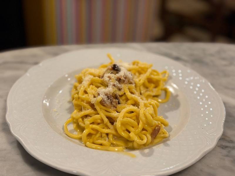 Паста тоннарелли с яйцами, копченой свиной щекой, сыром пекорино и черным перцем.