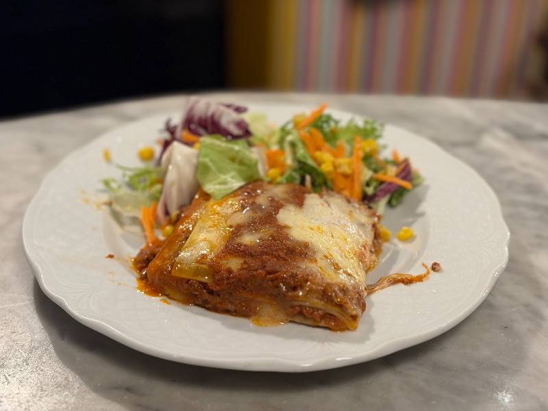 Традиционная лазанья болоньезе с говядиной, подается с салатом из свежих овощей.