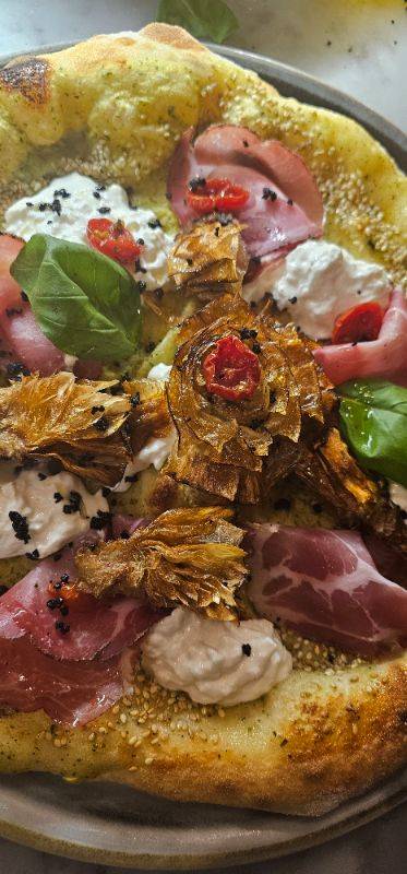 Base crema di carciofi e sesamo sui bordi. In uscita, stracciatella, capocollo di martina franca, cuore di carciofo fritto, pelatino confit, polvere di olive nere, basilico cristallizzato.