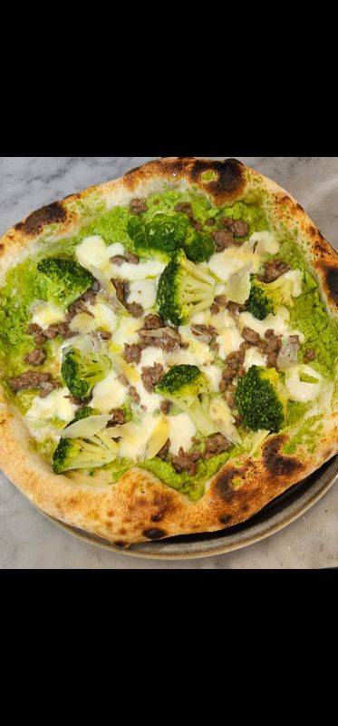 Base crema di broccoli, fior di latte, broccoli al vapore, salsiccia, olio evo. In uscita cacicavallo di grotta deliziosa e olio evo.
