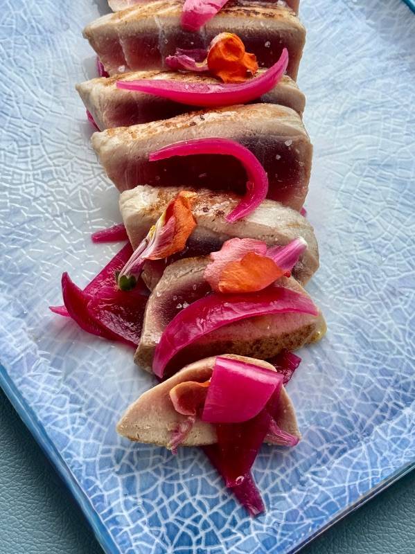 Pomodoro dello Chef, Mozzarella Ragusana, Cipolla Rossa Caramellata, Tonno, Datterino Giallo, Olive taggiasche, Origano, Olio Evo.