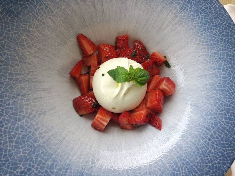 Mozzarella Ragusana, Pesto di Pistacchio Drago, Burrata Pugliese, ciliegino, Granella di Pistacchio, Olio Evo.