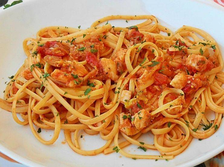Spaghetti di Grano duro trafilati al bronzo, ragù di Mare: pesce spada, calamari, gamberi e ciliegino.