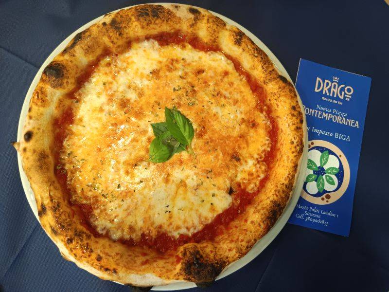 Pomodoro dello Chef, Mozzarella Ragusana, Melanzana Fritta Aromatizzata alla Menta, Mozzarella di Bufala, Grana in Cottura, Prosciutto Cotto, Basilico, Origano, Olio Evo.