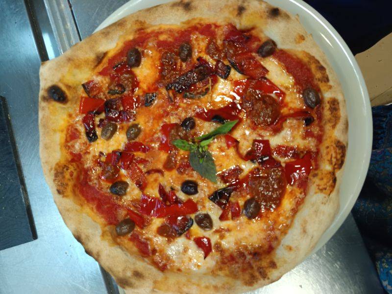 Pomodoro dello Chef, Mozzarella Ragusana, Olive taggiasche, Nduja, Peperoni, Basilico, Origano, Olio Evo.