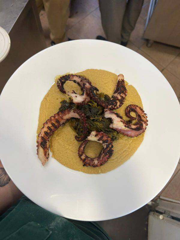 Bis di Bruschette al Salmone, tacos di insalata di polpo, frittura di calamari e gamberi.