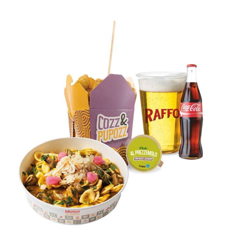 Puccia con polpette (manzo e maiale, pecorino e Grana Padano, uova e pane), salsa datterino e Grana Padano DOP, 1 porzione di pupozze e una bevanda a scelta tra un succo di frutta e una bottiglia d'acqua.