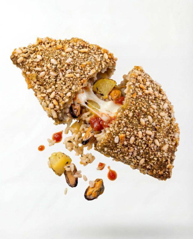 Pané avec riz croustillant, moules, fromage pecorino "LA CALCARA - ALTAMURA", pommes de terre, tomate "ROSSO GARGANO", mozzarella "GIOIELLA" DOP, poivron, oignon, ail