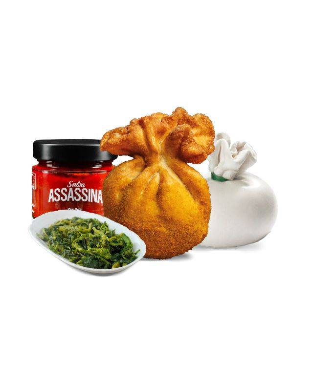 1 porzione di frittura di pesce, 1 maritozzo 100% semola di Altamura con burratina e Capocollo di Martina Franca, 1 panzerottino pomodoro e mozzarella DOP, una porzione di Polpett&Pupozz (polpette fritte, frittelle di semola e farina di riso) con salsa (a base di peperoni, patate, capperi, pomodoro datterino, prezzemolo fresco, aglio e pioggia di Pecorino) + 1 Spritz o 1 birra o 1 soft drink a scelta.