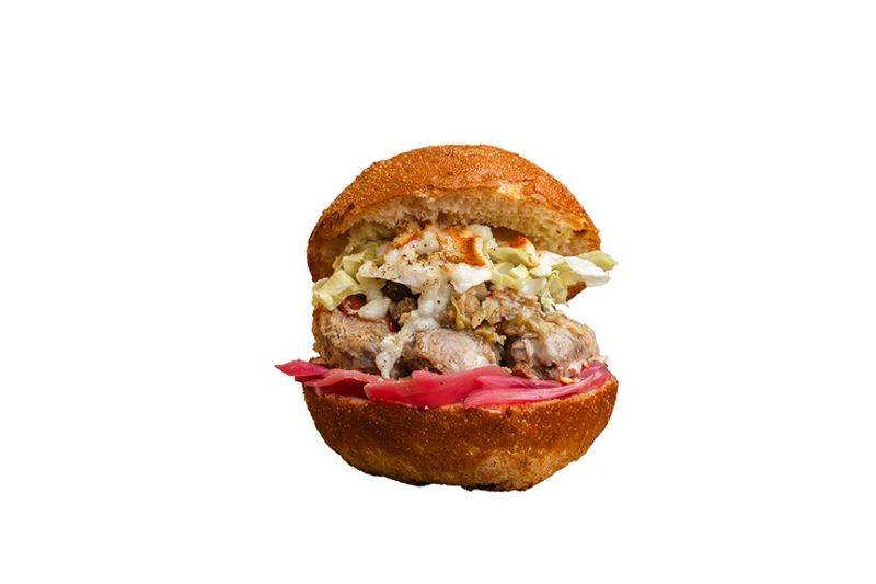 Pane 100% Semola di Altamura, spiedo di Bombetta doppia cottura prima a bassa temperatura e poi ripassata in olio e pangrattato, burratina fresca, salsa Puglieronata composta da peperoni al forno cotti con del datterino rosso, capperi, patate al forno, prezzemolo fresco, pangrattato e aglio, scamorza affumicata in forno, salsa Assassina handmade con pomodoro e aglio, pepe e olio Evo.