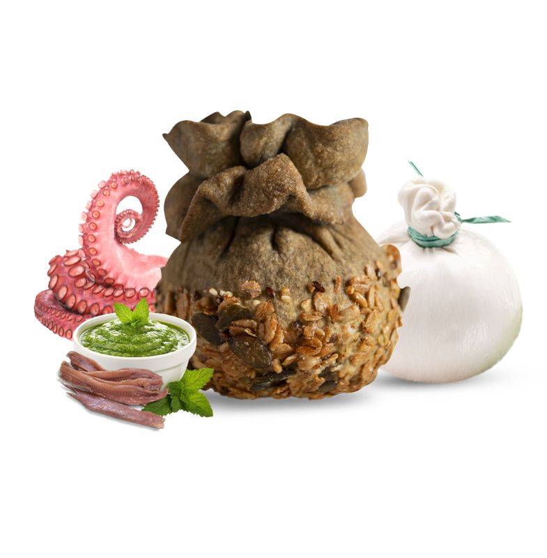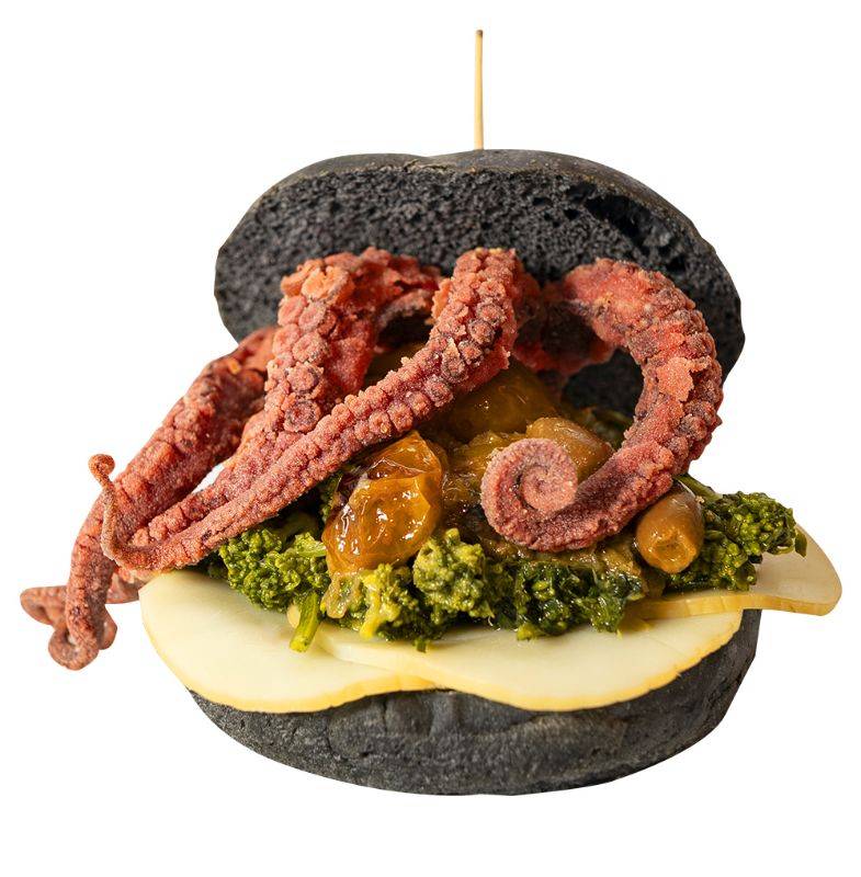 Charcoal semolina bread, with fried octopus breaded with purple carrot powder from Polignano, steamed turnip greens, smoked scamorza, baked cream with yellow datterino, spousal from Capitanata, pitted Bari olives, slightly spicy and delicate killer sauce, parsley, pepper and extra virgin olive oil.