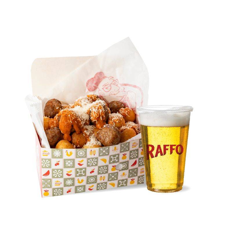 1 Portion of Polpett e Pupozz (semolina pupozze, beef and pork meatballs, pecorino cheese, Grana Padano, eggs, bread, and parsley, Puglieronata sauce (peppers, potatoes, capers, parsley, and garlic) and 1 Raffo beer.