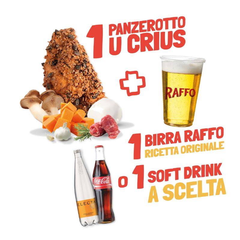 1 panzerotto 100% Altamura semolina dough, breaded with seed grains (pumpkin, flax, sunflower seeds, barley gritz, and soft wheat flakes) with Gioia del Colle DOP Mozzarella, baked pumpkin with cardoncelli mushrooms, rosemary, and garlic, 1 Bombetta double-steamed and fried in panzerotto, smoked scamorza, pepper, and Evo oil) +1 Raffo beer or soft drink of your choice.