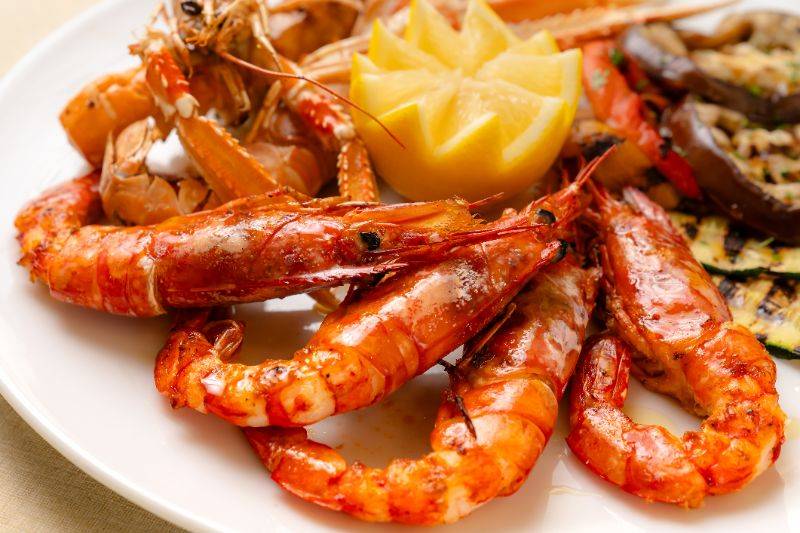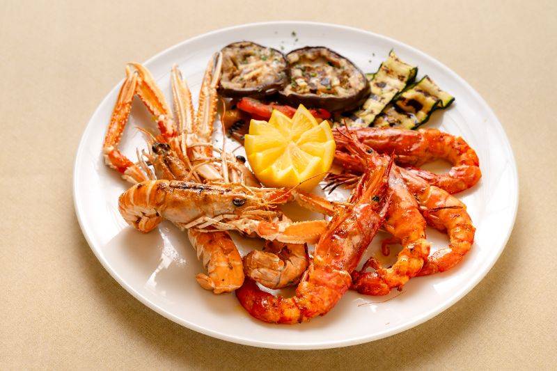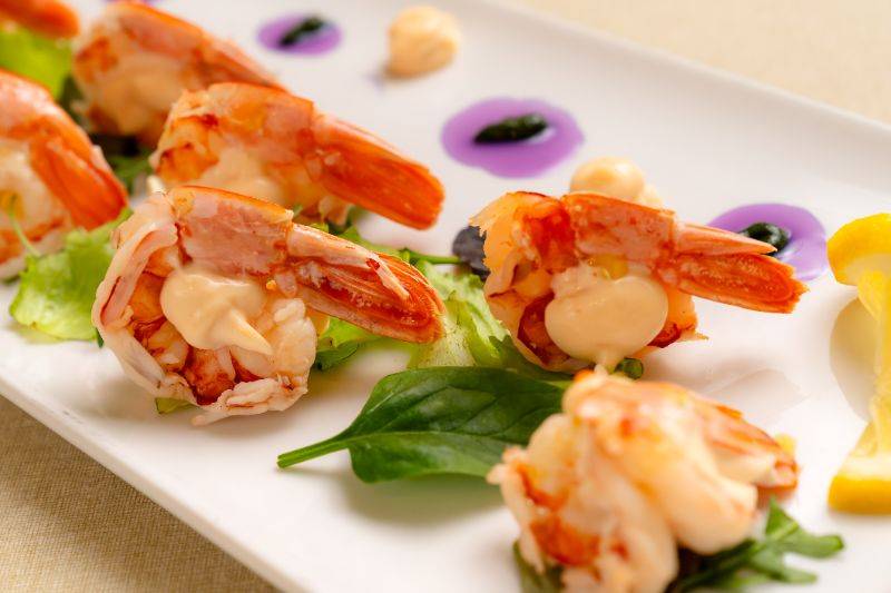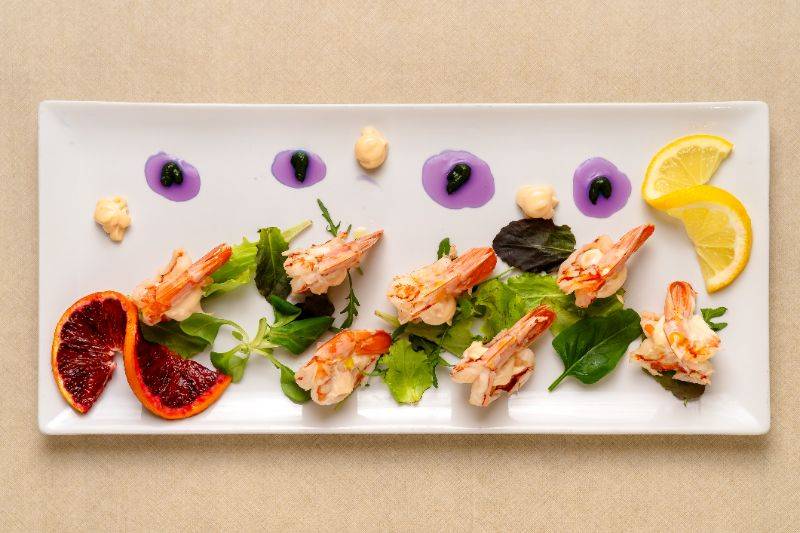 Gamberi selezionati serviti su misticanza e salsa ai profumi agrumati, per un antipasto raffinato e dal gusto equilibrato.
