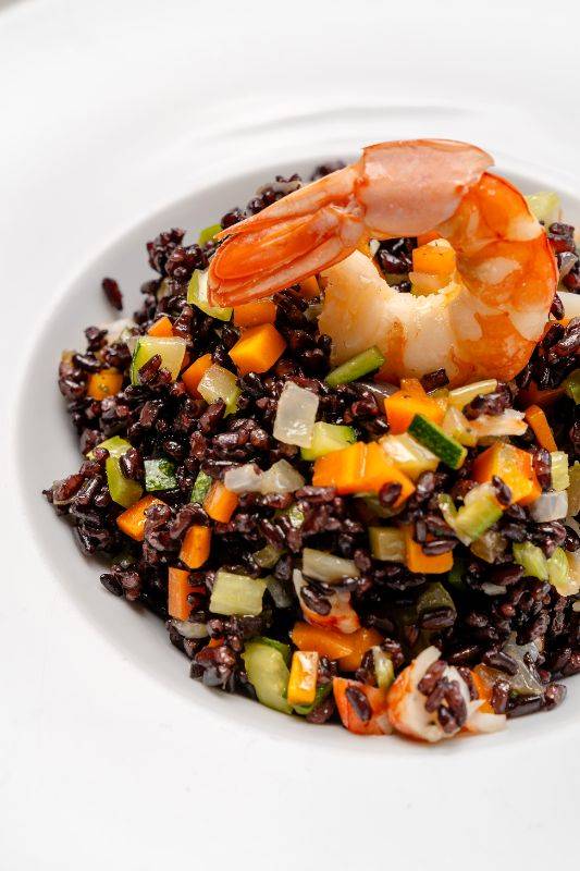Riso venere saltato con gamberi e verdure croccanti, per un piatto fresco, leggero e perfetto per la stagione estiva.