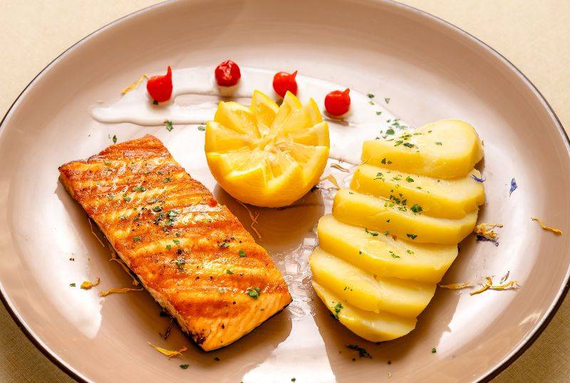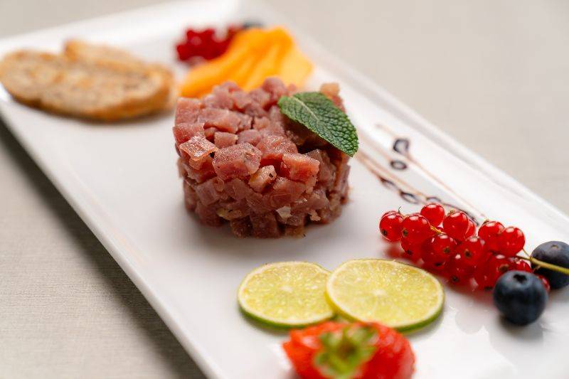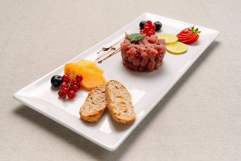 Tonno fresco tagliato al coltello e servito con frutta fresca e crostini, per un perfetto contrasto tra dolce e salato.