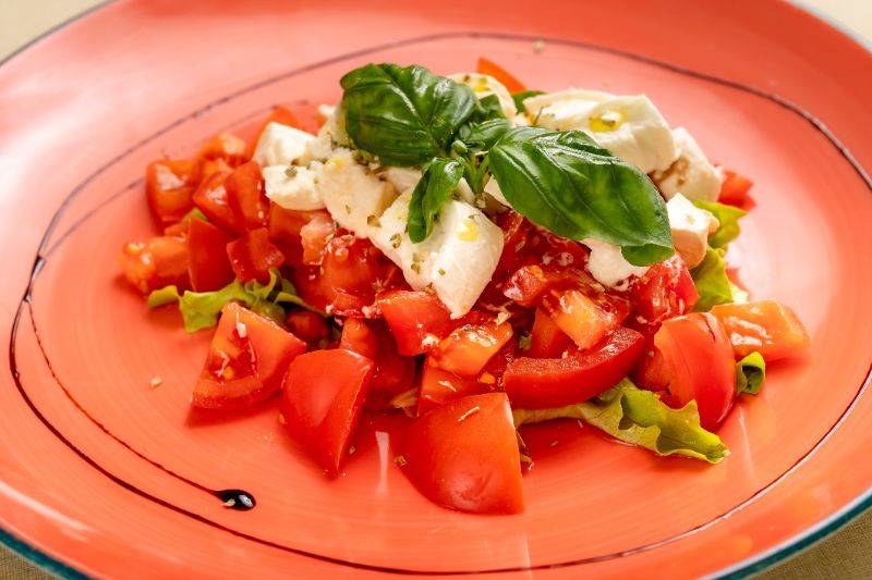 Pomodori maturi, mozzarella di bufala, basilico fresco conditi con un filo di olio extravergine d'oliva.