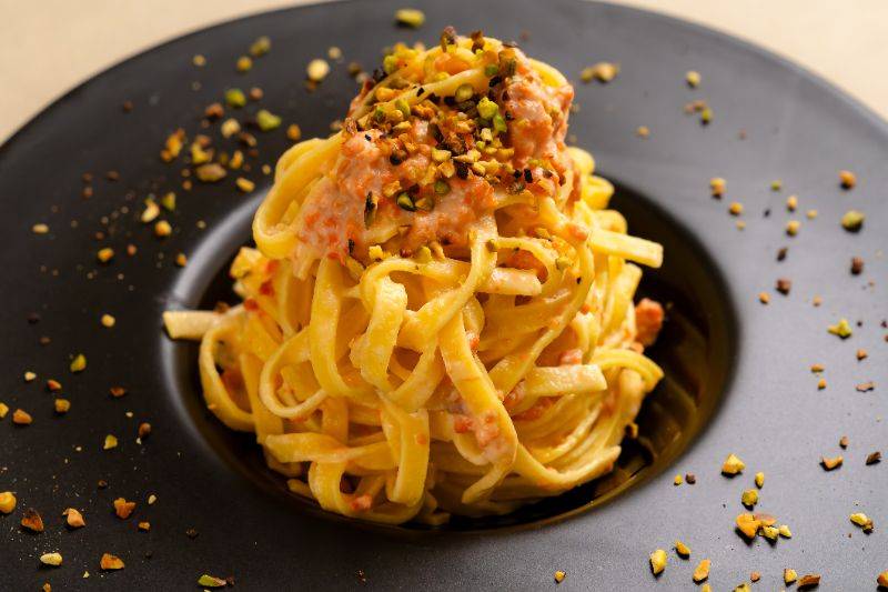 Taglierini freschi avvolti in una cremosa salsa al salmone e completati dalla croccantezza del pistacchio di Bronte.