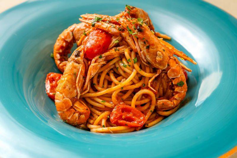 Ricetta tipica di Caorle, questi spaghetti sono conditi con scampi freschi in salsa pomodoro, aglio e prezzemolo. Un primo piatto saporito, che esalta il gusto dei crostacei con una nota leggermente piccante.