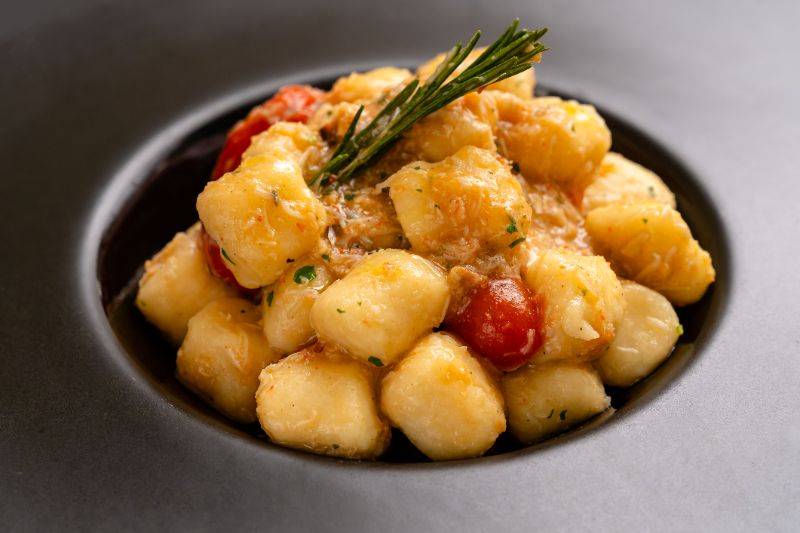 Morbidi gnocchi di patate saltati con polpa di granchio, pomodorini e un filo d'olio profumato al rosmarino. Un piatto cremoso e delicato.