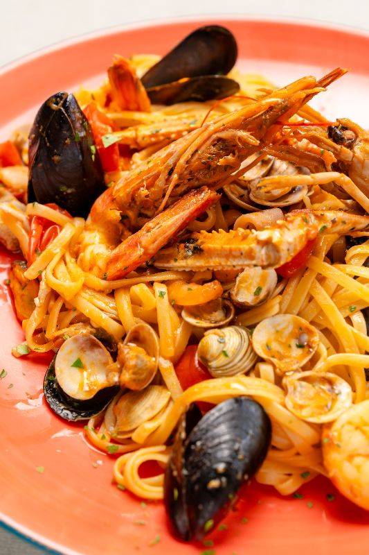 Linguine avvolte da un ricco condimento di pesce fresco e frutti di mare, insaporite con pomodorini. Un piatto caratteristico della cucina di mare.
