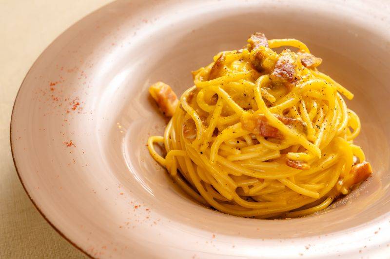 Un simbolo della cucina italiana: pasta avvolta in una cremosa emulsione di tuorlo d'uovo, pecorino romano e guanciale croccante.
