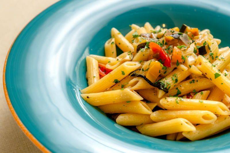 Un piatto fresco e colorato, con penne condite da un mix di verdure di stagione saltate in padella.