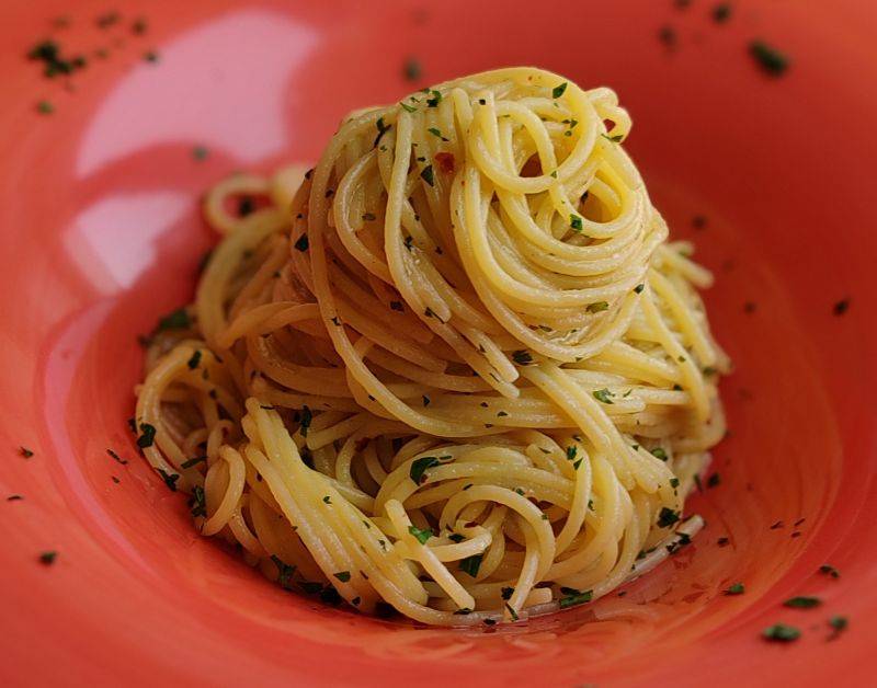 Spaghetti saltati con aglio dorato, olio extravergine d'oliva e peperoncino piccante. Essenziale ma ricco di carattere.