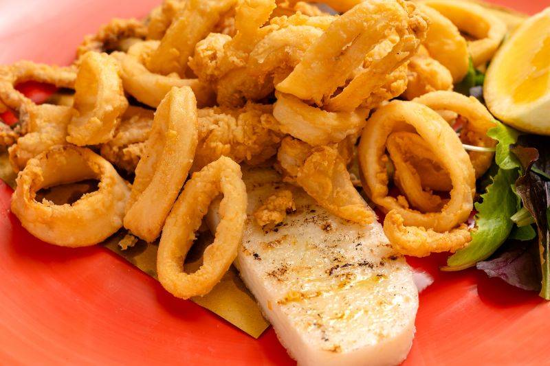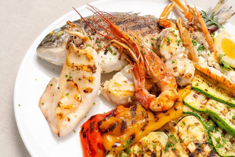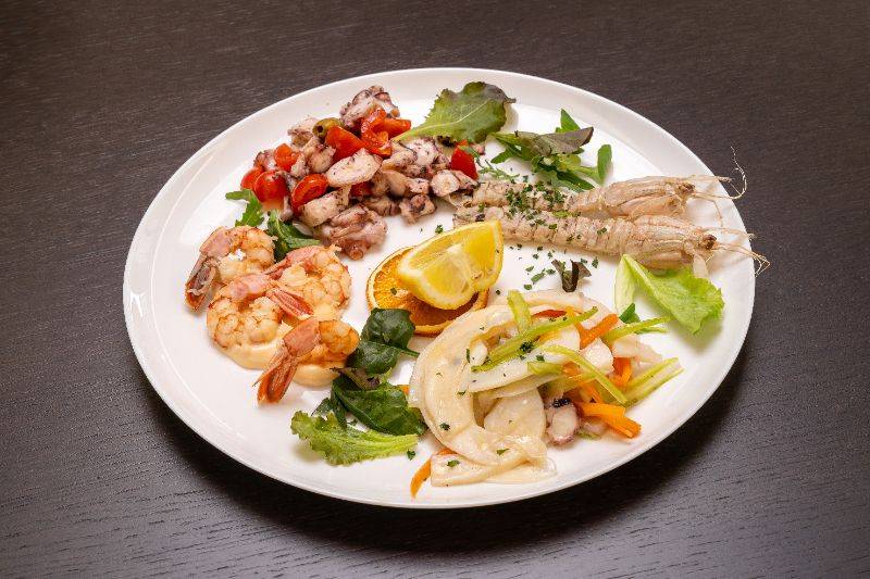 Antipasto bollito a base di piovra con pomodorini e olive, insalata di seppia, canocchia e gamberi in salsa. Un mix di sapori autentici del mare.
