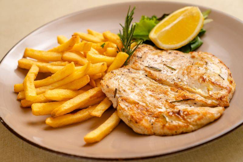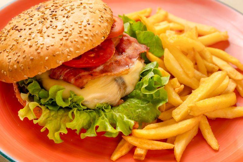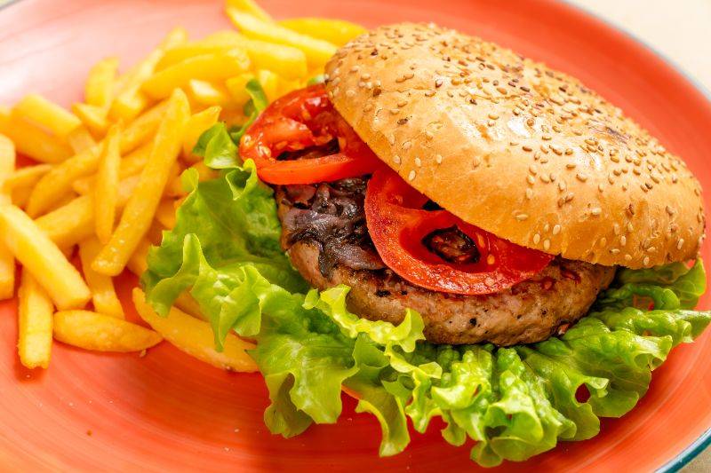 Hamburgher di manzo con fetta di formaggio cotto e servito con patatine fritte