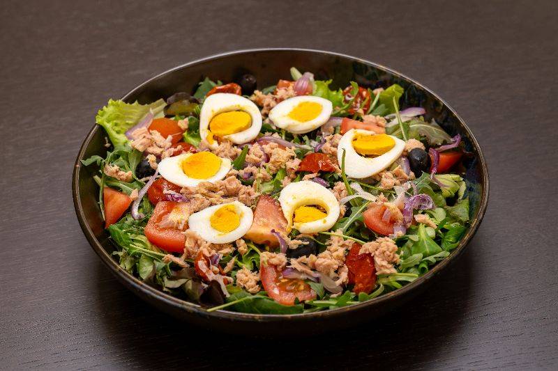 Mix di Insalate, pomodoro ramato, uova, lattuga, pomodorino, olive nere, cipolla di tropea, tonno