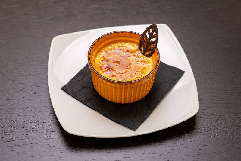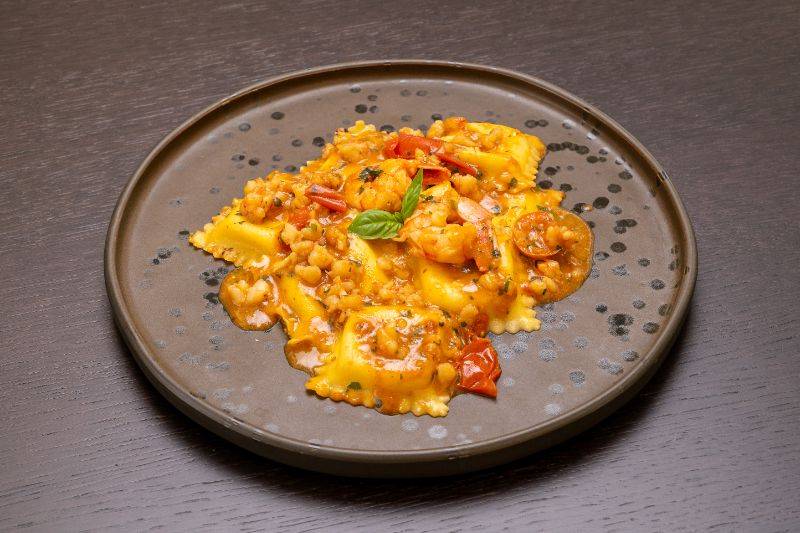 Ravioli ripieni di cremosa burrata, serviti con gamberi scottati e avvolti in una bisque delicata e profumata.