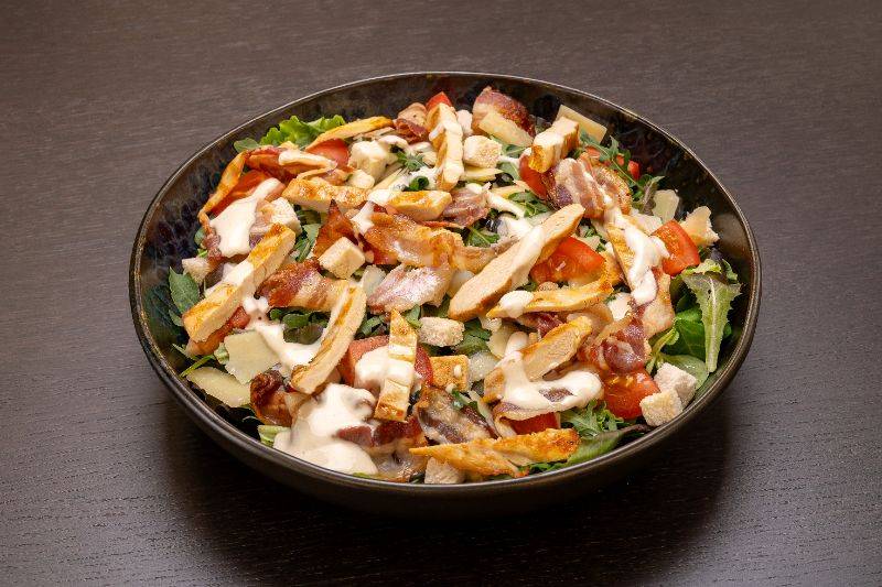 Mix di Insalate, pomodoro ramato, pollo grigliato, grana, bacon, crostini e salsa Caesar