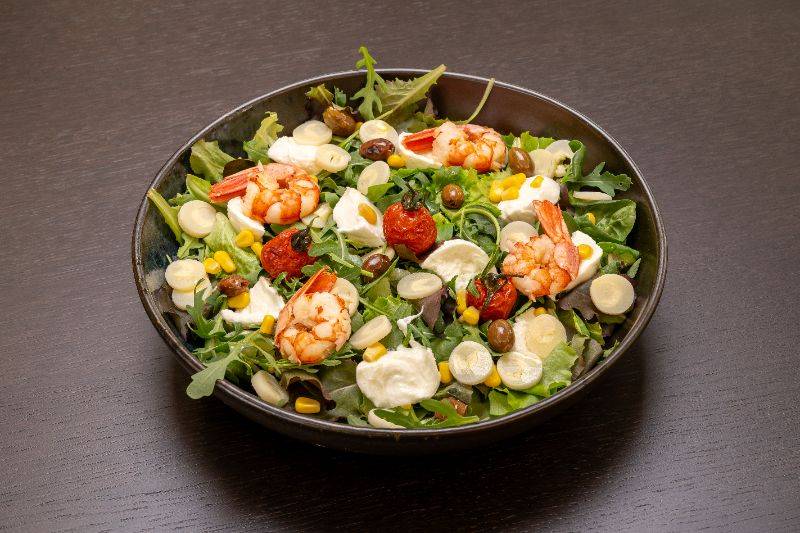 Mix di Insalate, pomodoro confit, bufala, olive, gamberetti, mais, cuore di palma