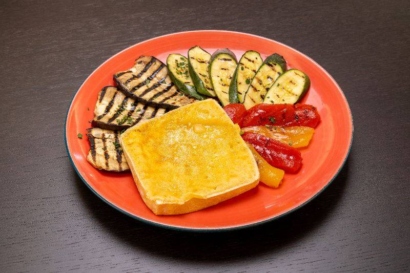 selezione di verdure stagionali grigliate ai ferri e servite accompagnate da una fetta di formaggio Dobbiaco cotto alla piastra