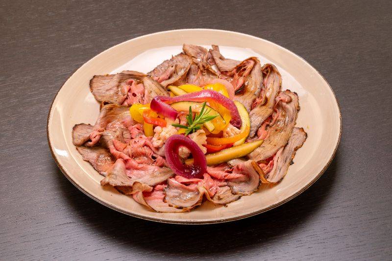 Roast Beef all'inglese tagliato a fettine e servito con verdure marinate fatte in casa