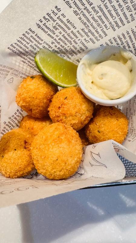 Arancino fatto con impasto di manioca, ripieno di pollo e spezie.