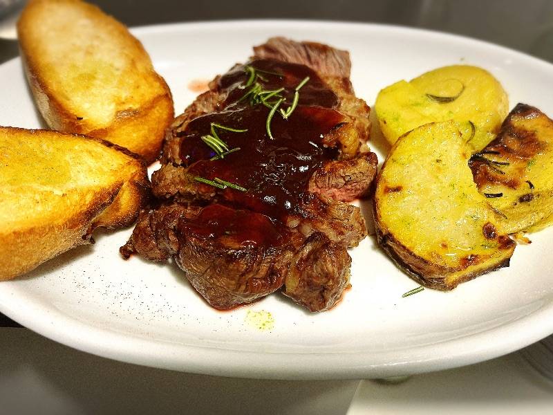 Argentinisches Fleisch ( 300 gr.)mit amerikanischer Soße, Ofenkartoffeln und geröstetem Brot