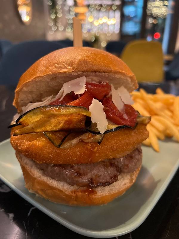 Hamburger di marchigiana 150gr, scamorza di Agerola affumicata panata e fritta, melanzane fritte, pomodorini semi dry alla mediterranea, scaglie di grana.