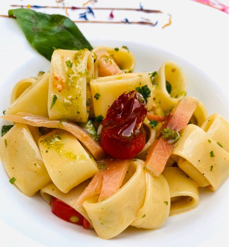 geräucherte Forelle, Zucchini, Kirschtomaten, Basilikum