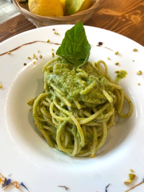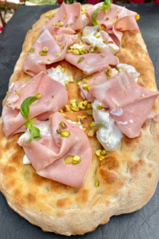 Tomato sauce, pistachio grains, mortadella and burrata cheese