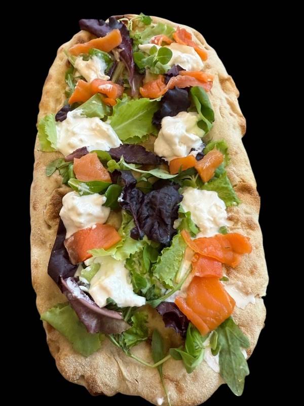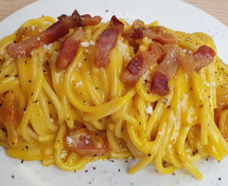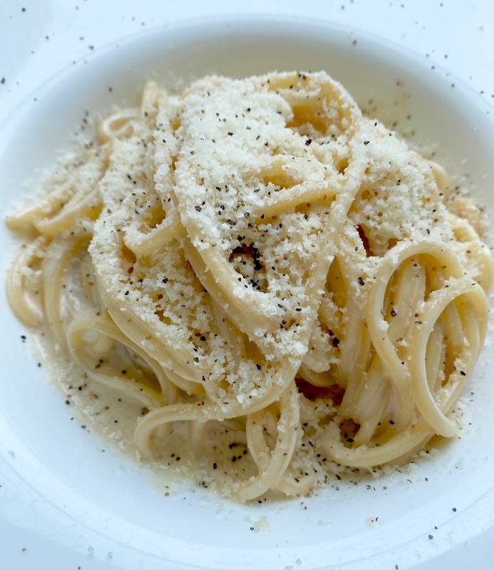 Mozzarella cheese, cheese and pepper cream, crunchy bacon, pecorino cheese