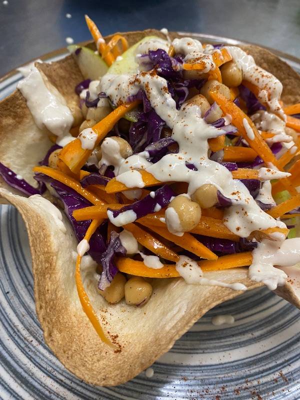 Red cabbage salad with julienned carrots, apples, chickpeas, and tahini sauce