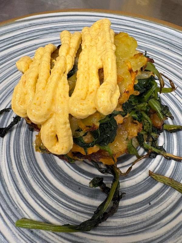 Potatoes and pumpkin Rosti millefeuille with sauteed broccoli and cannellini bean hummus, capers and dried tomatoes